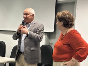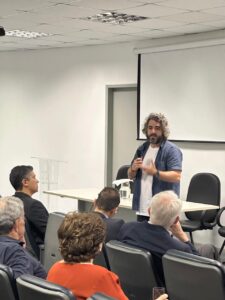 Leonardo, Coordenador de Pesquisa na Pró-Reitoria de Pós-Graduação e Pesquisa da UFJF, que representava a Pró-reitora, Professora Priscila, salientou a forte atuação da UFJF na pós-graduação, que hoje conta com mais de uma dezena de programas profissionais. Ele enfatizou que a universidade tem trabalhado intensamente em planejamento estratégico e autoavaliação, pontos essenciais para crescer e atingir cada vez mais os níveis de excelência. Na sequência, Cassiano Caon, vice-coordenador do programa, lembrou que o CAEd dá o suporte necessário ao mestrado, destacando seu pioneirismo por ser o primeiro programa profissional do país focado especificamente nessa área da educação. Ele celebrou a marca de mais de 1.300 mestres e mestras formados com o objetivo de continuar formando gestores para as escolas públicas.